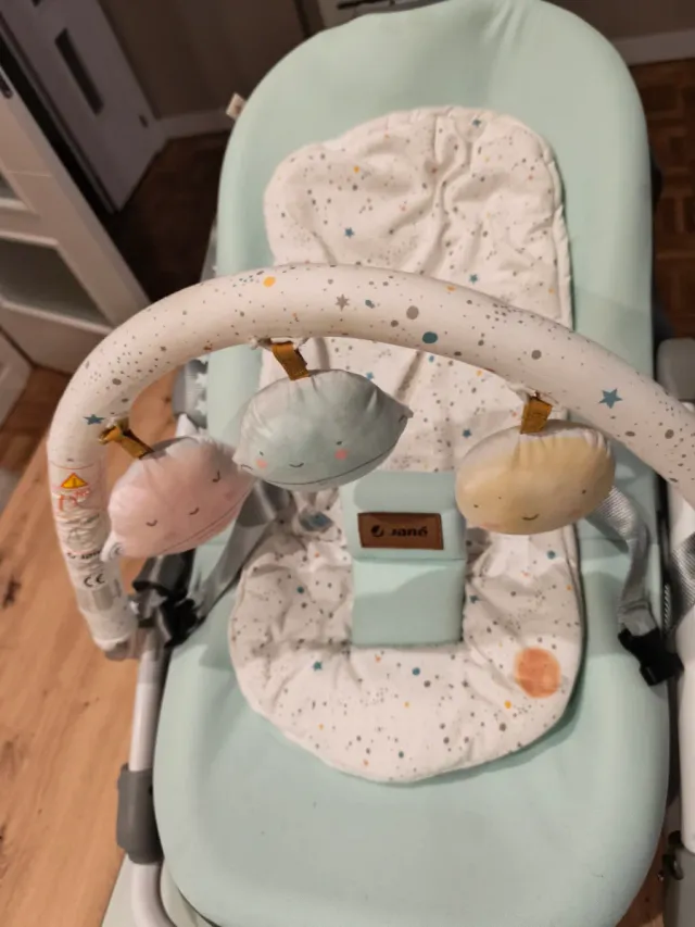 Detalles del productoHamaca para bebé de la marca Jané en color verde agua. Incluye arco de juegos con peluches.