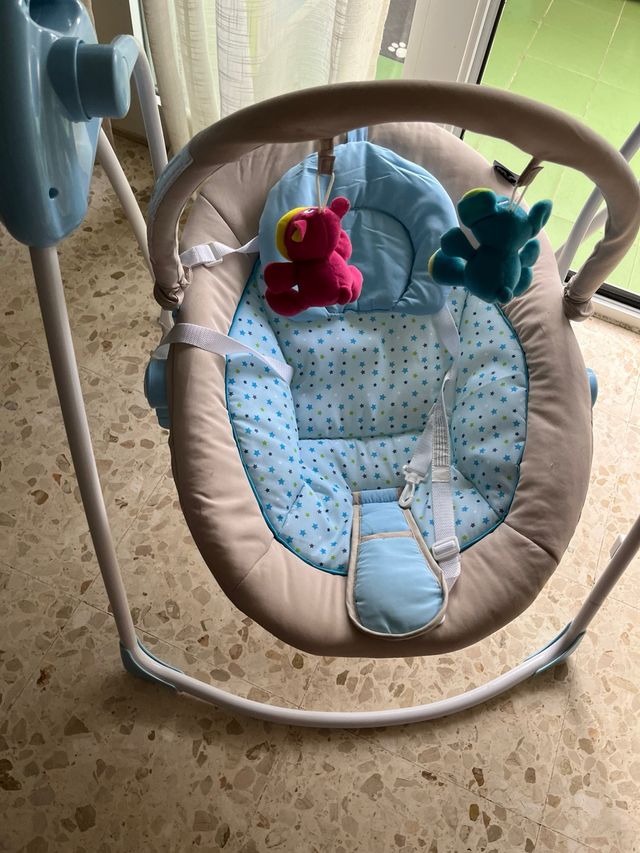 Tiene un mes de uso , se vende con la caja y con la base manual por si quiere balancearlo el progenitor, tiene varias velocidades automáticas y distintos sonidos musicales , sustituí una bolita de presión por un tornillo ya que estaba suelto y funciona perfectamente sin signos de uso.