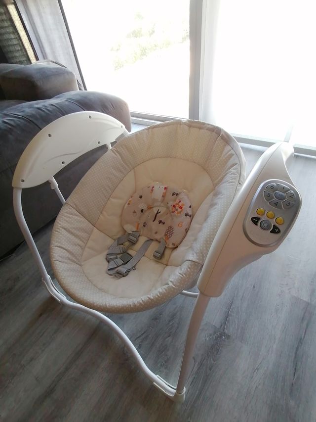 Detalles del productoHamaca para bebé con sus suaves movimientos. Con 6 velocidades. Cuenta con melodías, sonidos de la naturaleza y sonidos blancos con control de volumen. Con anclajes para sujeción. Muy poco uso Medidas del producto