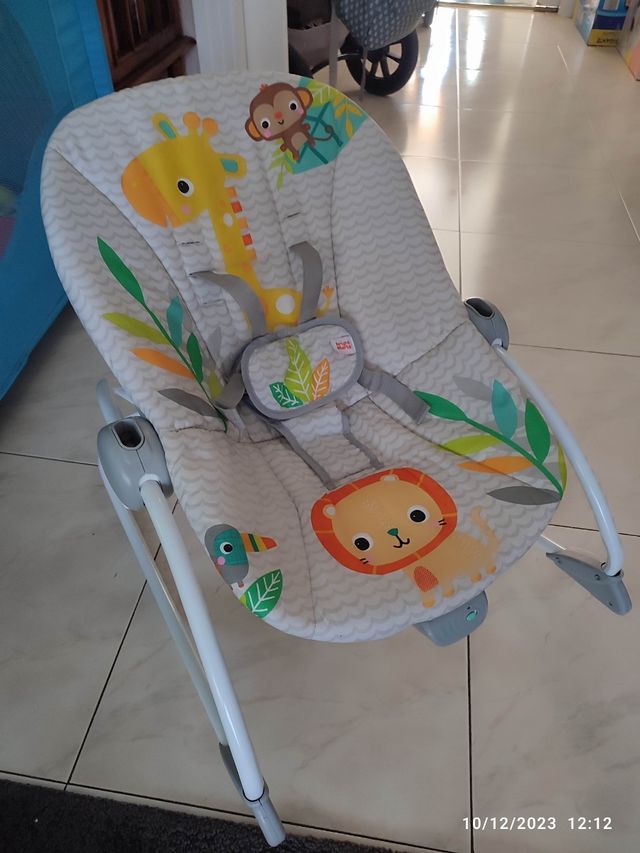 Asiento reclinable, barra de juguetes desmontable, se traba en posición fija, Vibración relajante, la almohadilla del asiento es de fácil limpieza.