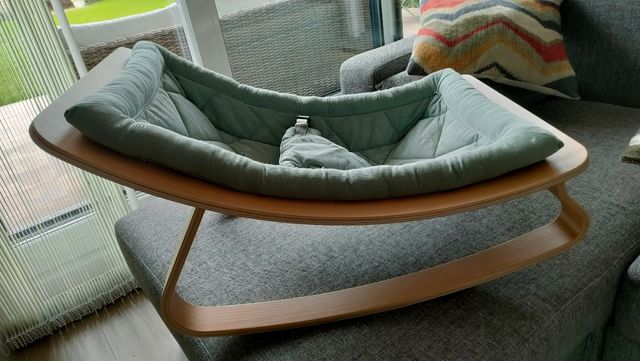 Detalles del productoPreciosa hamaca mecedora LEVO para bebé, de madera natural y suave cojín verde.