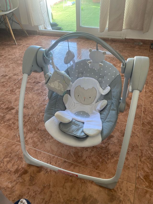 Hamaca para bebé en tonos grises. - Diseño acolchado para mayor comodidad. - Incluye varios juguetes colgantes. - Estructura resistente y segura.