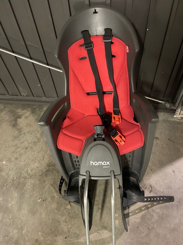 Silla portabebés Hamax Smiley para bicicleta. - Color gris y rojo. - Arnés de seguridad. - Reposapiés ajustables. Jujtas 50€ separadas 30€