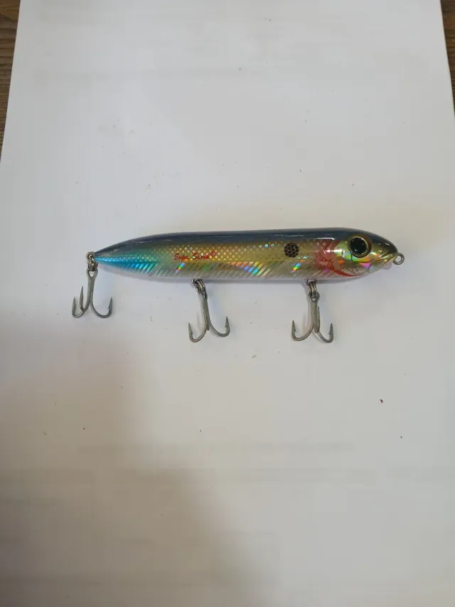 Señuelo de pesca Heddon Super Spook. - Diseño realista con acabado holográfico. - Equipado con tres anzuelos triples. - Ideal para la pesca deportiva.