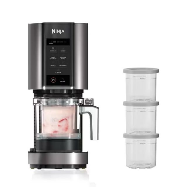 Máquina para hacer helados y postres congelados de la marca Ninja. Incluye varios recipientes para almacenar.
