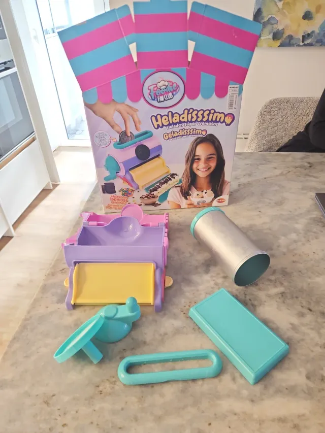 Juguete para hacer helados Heladisssimo. - Incluye máquina y accesorios. - Colores: morado, amarillo y azul. Utilizado una sola vez.
