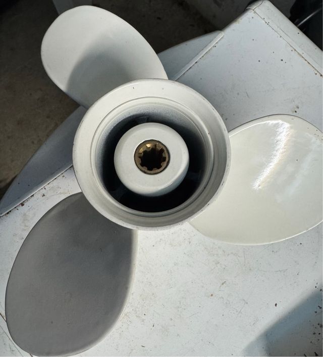 Hélice de repuesto para motores Yamaha o Parsun. Es un artículo nuevo. - Color blanco. - Diseño de tres palas. - Eje estriado para acople.