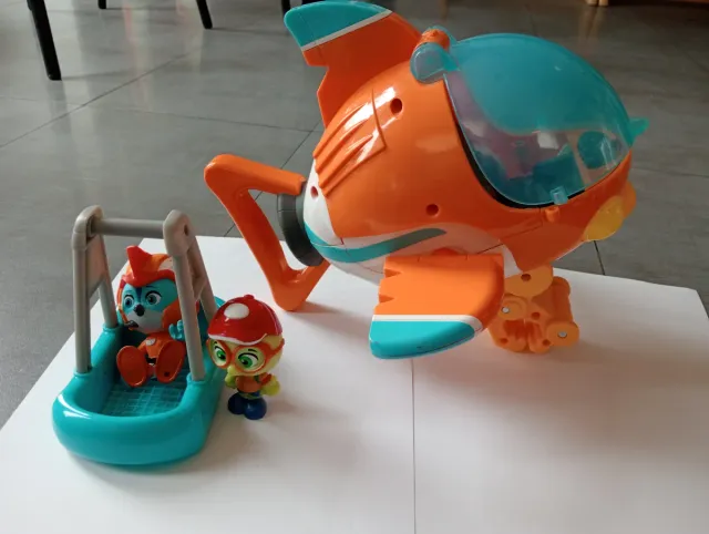 Set de juego de helicóptero de Top Wing de rescate con dos figuras.