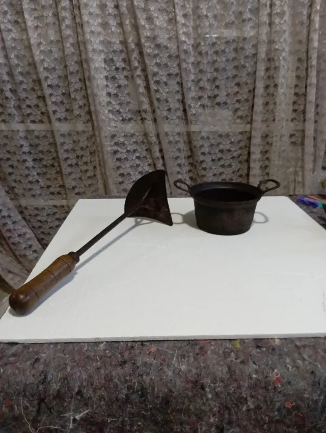 Conjunto de objetos antiguos, ideales para coleccionistas o decoración. - Herramienta de jardín con mango de madera. - Cubo metálico con asas.
