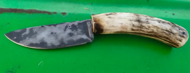 Herramienta de corte con hoja de acero de damasco y mango de asta. - Hoja con diseño martillado. - Mango de asta natural con vetas oscuras... último precio