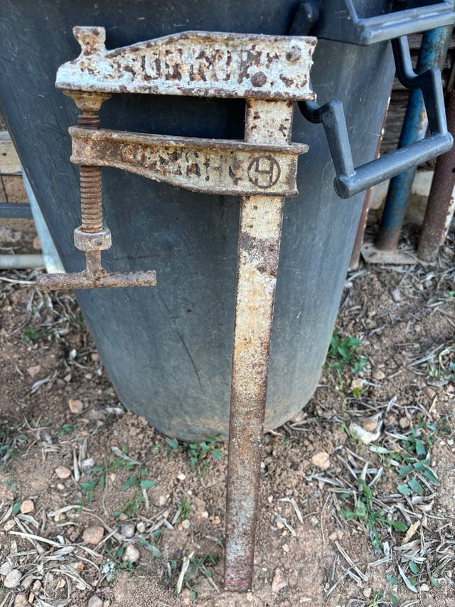 Herramienta de prensa antigua, ideal para trabajos de carpintería o obra. Fabricada en metal resistente. - Diseño robusto y duradero. - Mecanismo de apriete manual.