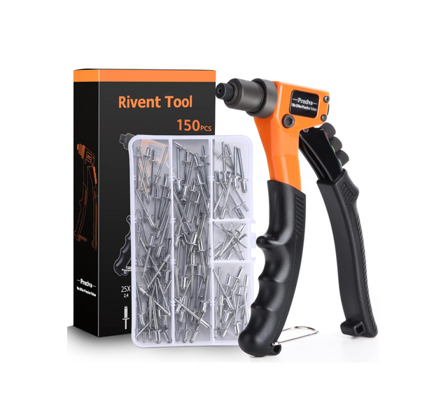 Detalles del productoKit de remachadora Preciva con 4 tamaños (3/32", 1/8", 5/32", 3/16") y 150 remaches de aluminio. Su cabeza giratoria y cambio rápido de mandriles facilitan el trabajo. Fabricada en aleación de aluminio, ligera y duradera, con mango ergonómico antideslizante de PVC. Incluye bolsa de almacenamiento. Apta para remaches de aluminio, acero y acero inoxidable, ideal para automoción, muebles y mantenimiento. Herramienta resistente y duradera, perfecta para bricolaje y trabajos domésticos o profesionales.