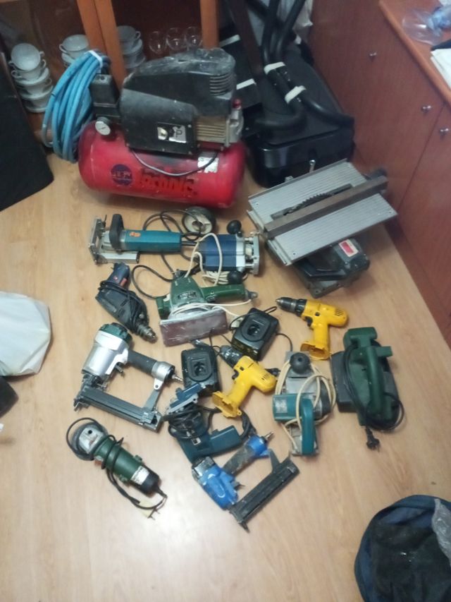 - Incluye compresor, router, lijadora, taladro, varias pistolas de clavos, etc.el compresor no tiene manguera