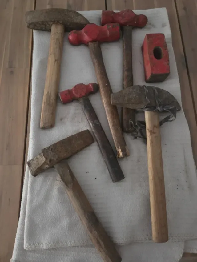 - Martillo de cantero con mango de madera y cabeza de metal.