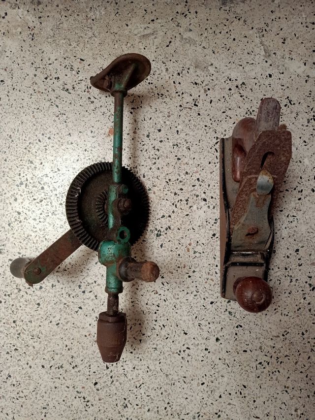 Vendo cepillo y taladro manual de carpintería de los años 50 en perfecto estado de uso.