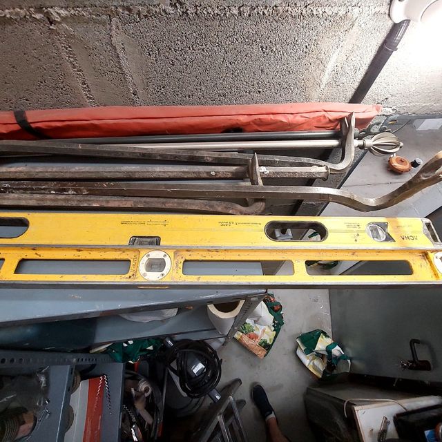 Lote de herramientas de construcción. - Nivel de burbuja amarillo. - barra de uñas - tijeras de cortar hierro