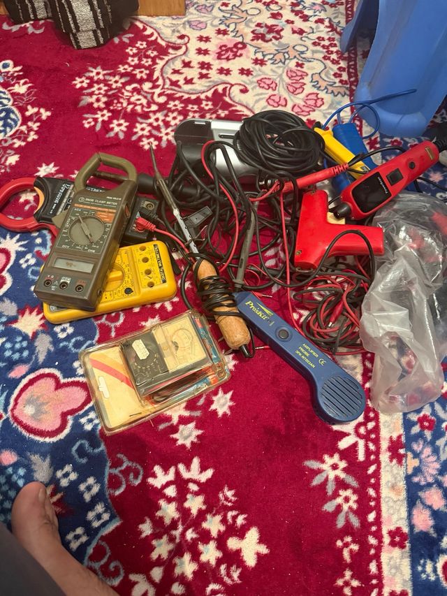 Lote de herramientas eléctricas y accesorios. - Multímetro digital. - Pinza amperimétrica. - Comprobador de circuitos. - Cables y conectores.