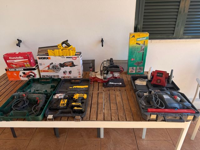 - Incluye sierra circular Worx, sierra de mano, taladro percutor Black & Decker, dos taladros atornilladores inalámbricos (uno amarillo y otro verde), amoladora, y una prensa de taladro Wolfcraft.