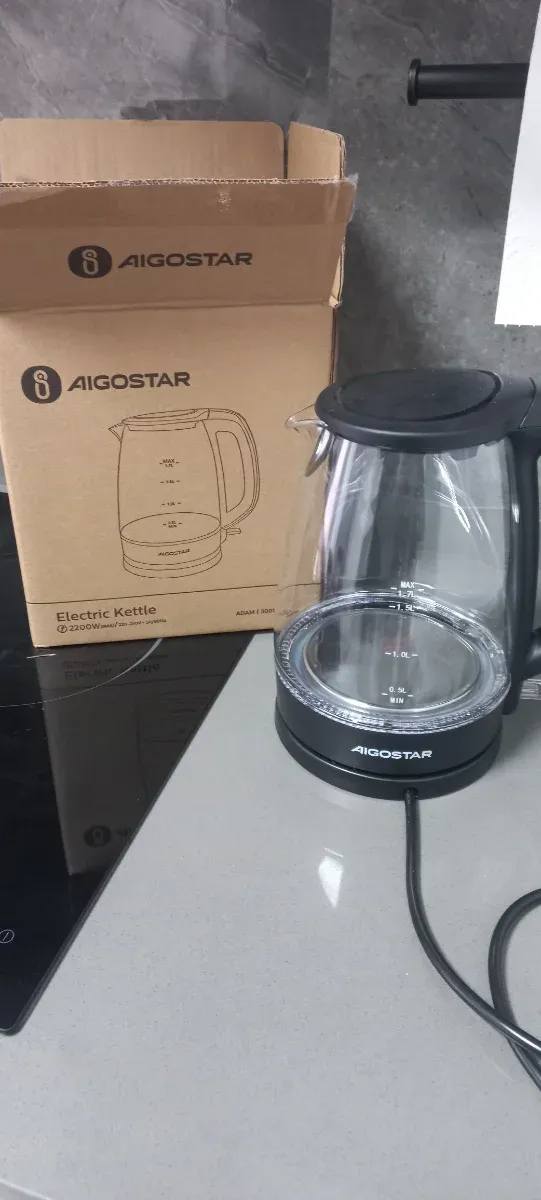 Detalles del productoHervidor de agua de cristal de la marca Aigostar. Tiene una capacidad de 1.7 litros y una potencia de 2200W.