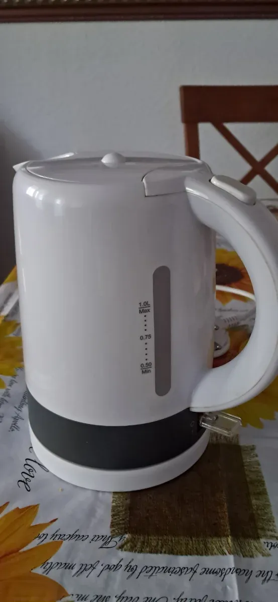 Hervidor de agua eléctrico de color blanco. - Capacidad máxima de 1.0L. - Indicador de nivel de agua. - Base giratoria de 360 grados.