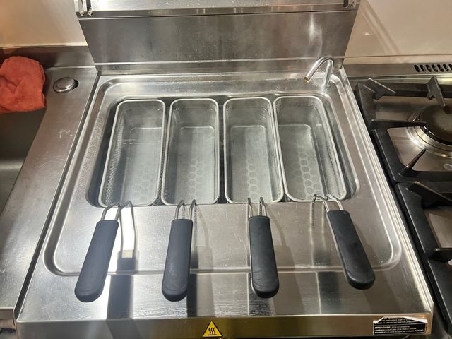 Hervidor de pasta profesional con cuatro cestas.