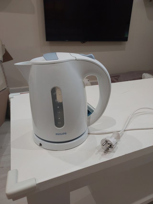 Detalles del productoVendo hervidor de agua eléctrico Philips de color blanco. Está en buen estado y es muy práctico para calentar agua rápidamente.