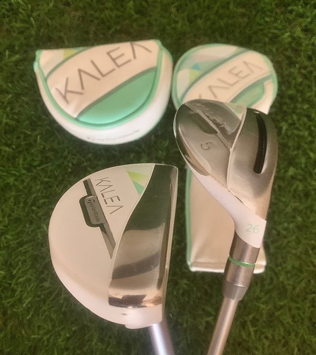 Detalles del productoHibrido y putter de golf TaylorMade Kalea para mujer. Putter mujer TAYLORMADE KALEA en perfecta condicion con funda piel KALEA. Hibrido 5 TAYLORMADE KALEA loft 26 con funda piel.