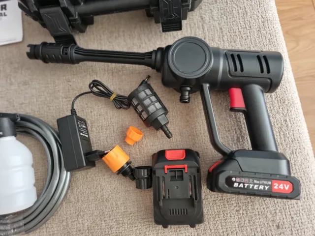 Detalles del productoHidrolimpiadora portátil a batería de 24V, ideal para limpieza exterior.
