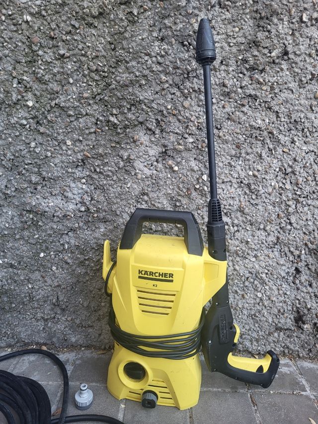 Hidrolimpiadora Karcher K2 de color amarillo. - Incluye lanza y manguera. - Compacta y fácil de usar.