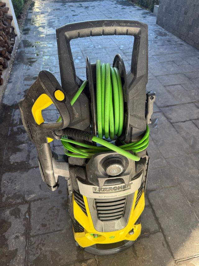 Detalles del productoHidrolimpiadora Karcher K7 Premium en color amarillo y negro. Incluye manguera enrollada.