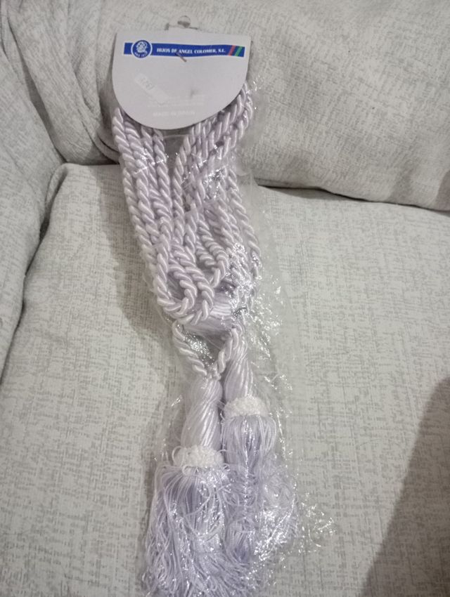 Cuerda decorativa con borlas de Hijos de Angel Colomer. - Cuerda trenzada en color blanco. - Dos borlas decorativas en los extremos. - Empaquetado original.