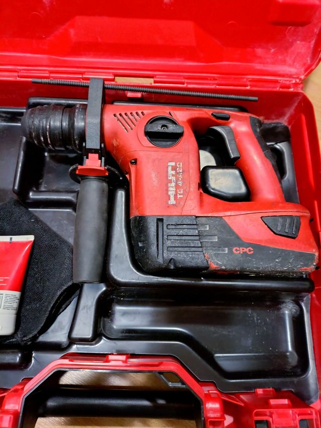 Detalles del productoTaladro martillo Hilti TE-4 A22, en perfecto estado de funcionamiento. Con dos modos de funcionamiento, atornillador y taladro atornillador. Incluye 1 batería de 5Ah y maletín de transporte.