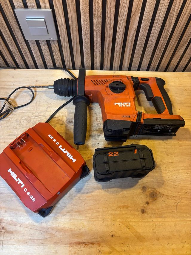 Detalles del productoTaladro percutor Hilti TE 6-22 en color naranja y negro. Incluye cargador y batería.