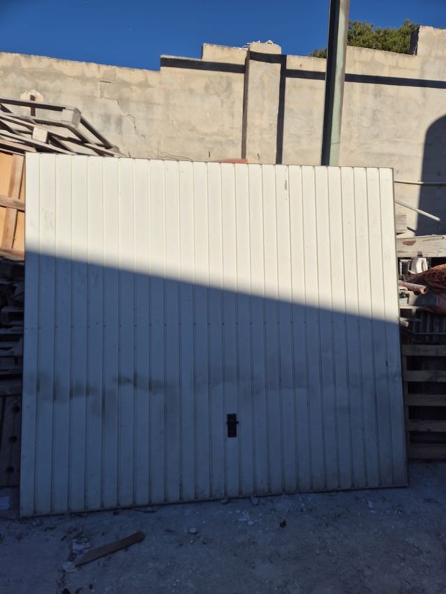 Hoja de puerta de garaje de color blanco. - Diseño acanalado vertical. - Incluye manilla negra.