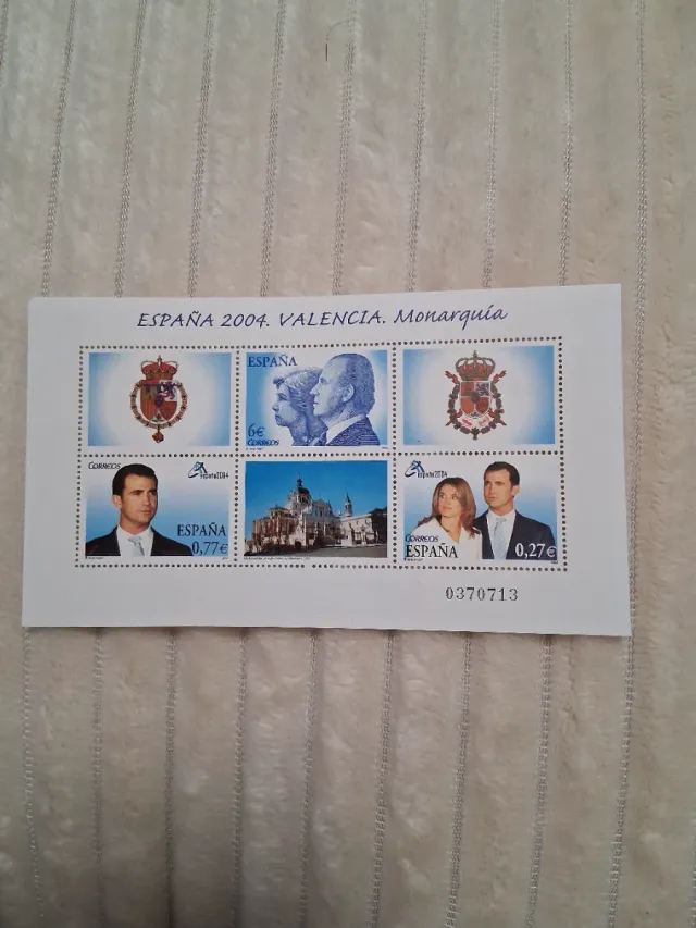 Detalles del productoHoja de sellos conmemorativa de España del año 2004, dedicada a Valencia y la Monarquía.