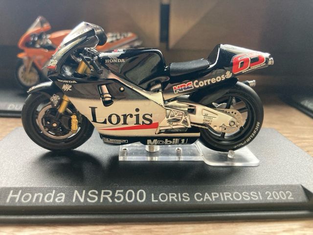 Detalles del productoRéplica detallada de la Honda NSR 500 de Loris Capirossi del año 2002.