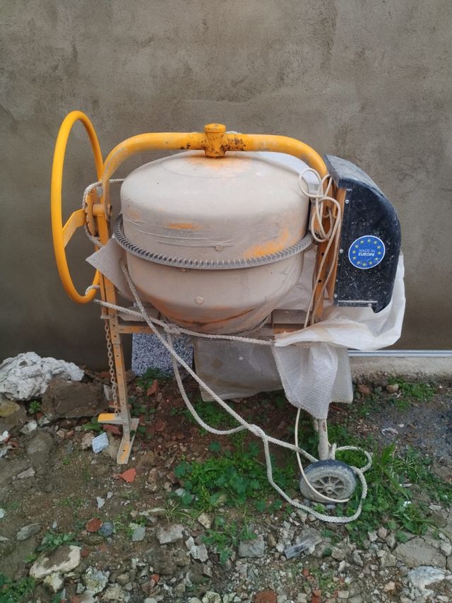 Detalles del productoHormigonera eléctrica de color amarillo, ideal para trabajos de construcción.