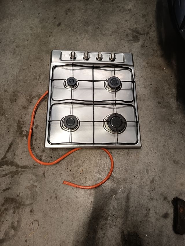 Detalles del productoCocina de gas en acero inoxidable de cuatro fuegos. Está en buen estado, lista para usar.