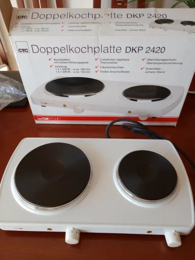 Hornillo eléctrico doble CTC DKP 2420 con dos fuegos. - Placas de alta eficiencia. - Termostatos regulables. - Indicadores luminosos. - Base antideslizante.