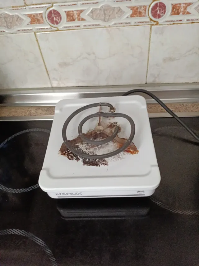 Hornillo eléctrico portátil de la marca MARUX. - Diseño compacto y fácil de usar. - Superficie de cocción en espiral.