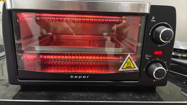 Detalles del productoHorno de convección BEPER de 12 litros, color negro y con carcasa de aluminio. Con resistencias de cuarzo y grill de acero perfecto para asar, calentar o cocinar sus alimentos, El horno de cocina incluye un grill y una bandeja de horno.
