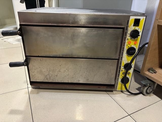 Detalles del productoHorno de acero inoxidable con dos niveles para calentar pizzas.