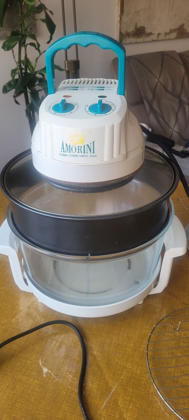 Horno de convección AMORINI. - Modelo: Turbo Combi Grill 10000. - Diseño blanco con asa turquesa. - Incluye rejilla metálica.
