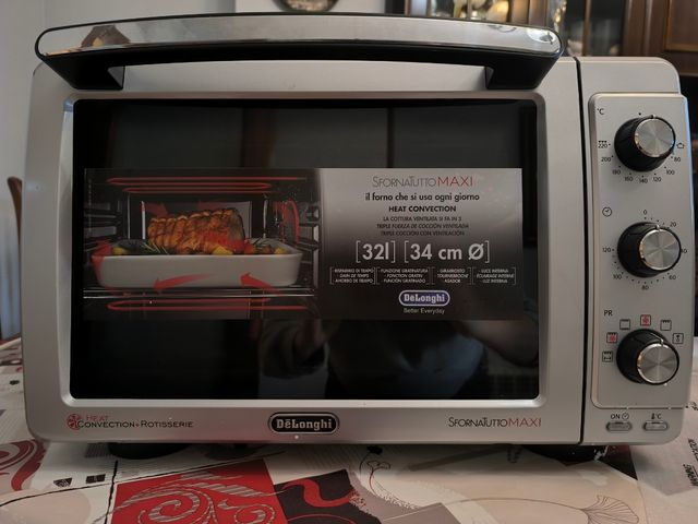 32 litros, 34 cm, completo con bandeja plana , gancho para pollo, 2 bandejas ranuras, 2200w.
