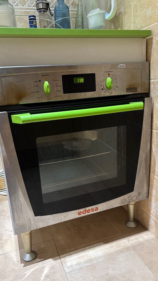 Horno eléctrico de libre instalación con estructura. Tiene el termostato estropeado pero funciona - Color: Acero inoxidable y verde. - Marca: Edesa. - Patas ajustables.