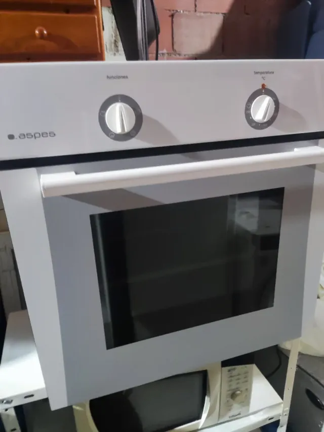 Horno eléctrico Aspes de color blanco. Mide 0.60 por 0.60 - Diseño moderno y funcional. - Panel de control con dos mandos. - Puerta con cristal. - Asa frontal.