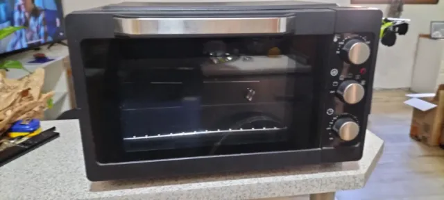 Detalles del productoHorno eléctrico portátil en color negro. Ideal para cocinas con espacio limitado o para llevar de camping.