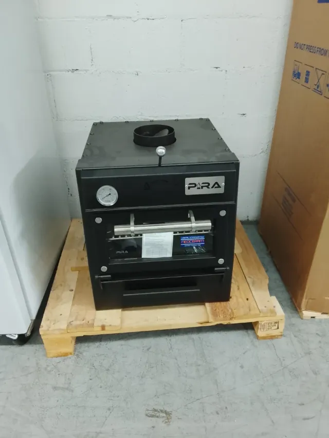 Detalles del productoHorno de leña Pira en color negro, ideal para exteriores. Se encuentra sobre un palé de madera.
