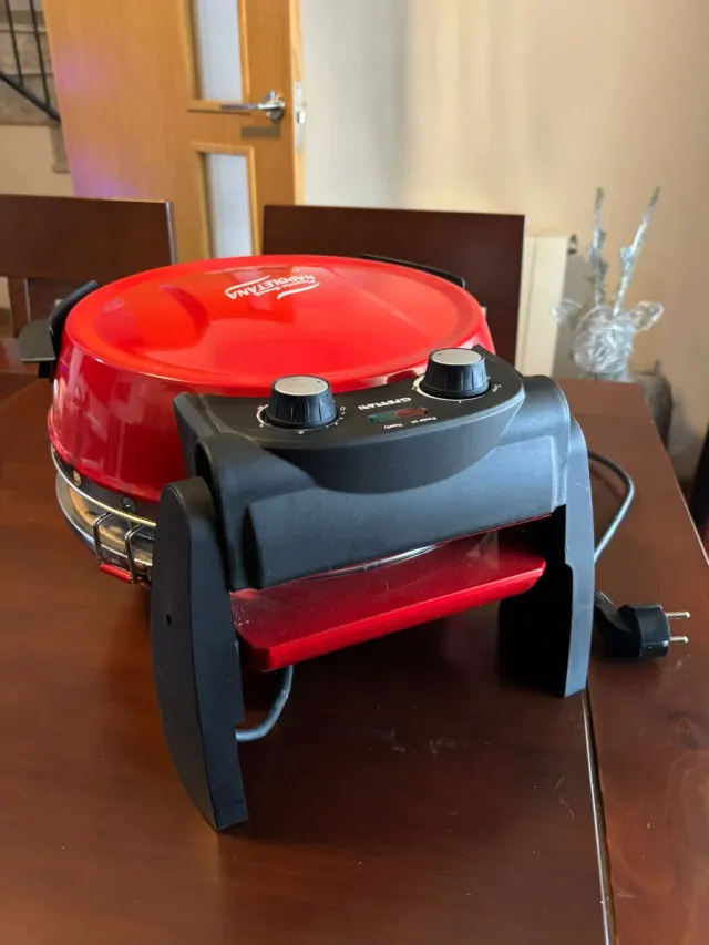 Cuenta con termostato ajustable hasta 400 °C, temporizador de 5 minutos, dos platos de piedra refractaria de 31 cm de diámetro y doble resistencia de acero para una cocción uniforme. Incorpora indicador luminoso de funcionamiento. Su potencia es de 1200 W, con un peso de 5,9 kg, y funciona con alimentación AC 230 V ~ 50 Hz.