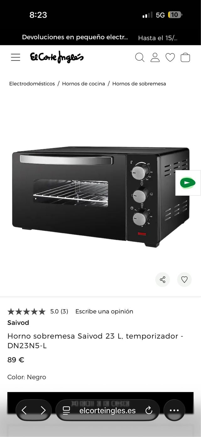 Detalles del productoHorno de sobremesa Saivod con capacidad de 23 litros y temporizador.